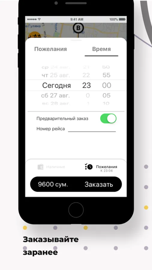 Нужен автомобиль к определенным времени и дате? Закажите его заранее через приложение, и в назначенное время такси будет ждать вас у подъезда.