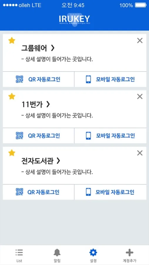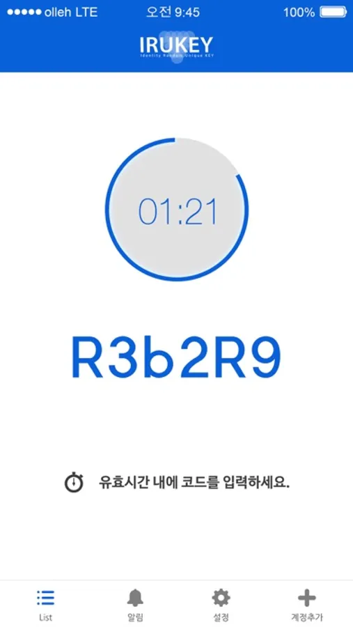 계정 선택 후, 생성되는 IRUKEY 코드를 시간이 초과되기 전 입력하여 로그인 완료