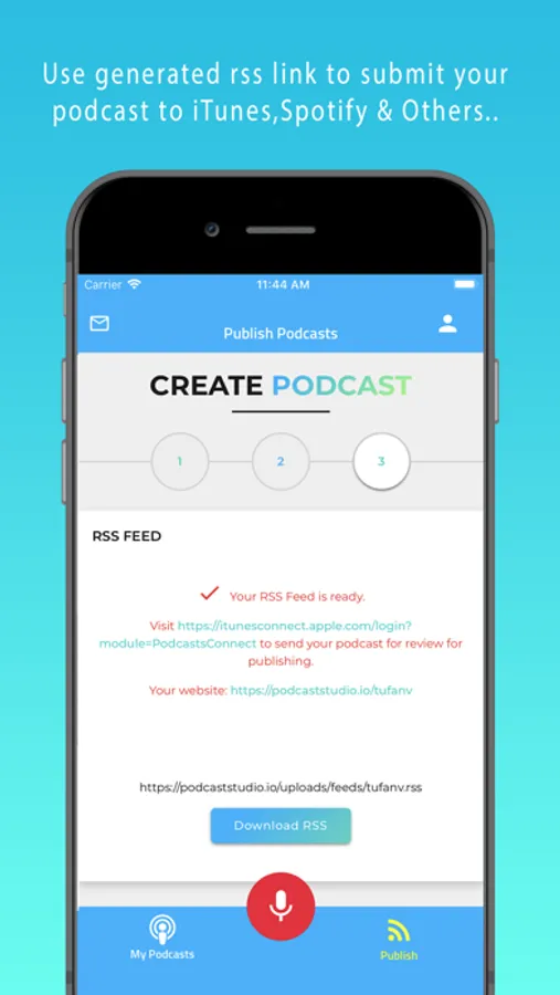 - Upload the podcasts whenever you want and publish them with just one click to create a ready-to-go website in minutes which you can share with anyone to let them listen to any episode. We also create a rss feed for you which you can send to podcast connect ( itunes ) or other services and publish your podcast to those services.