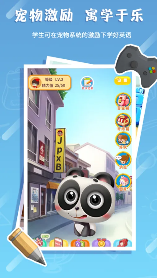 在【金牌学霸】APP学生端中,学生可以一边学习《金牌新概念》二册课程,一边养可爱的宠物。其中还包括题库、作业等模块,能够让学生在享受养宠物的乐趣的同时,学好英语;