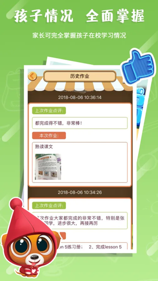 在【金牌学霸】APP家长端中,家长可以查看孩子成绩及作业情况、在线请假、评价老师、查看抢到的红包等。方便家长更快地了解孩子在校情况,解决“家校共育”难题。