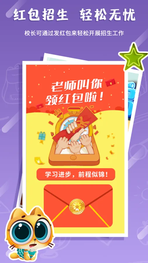 在【金牌学霸】APP校长端中,校长可以进行教师管理、发送和管理红包等功能。既能让校长方便快捷管理教师,又能够利用红包功能开展招生工作。