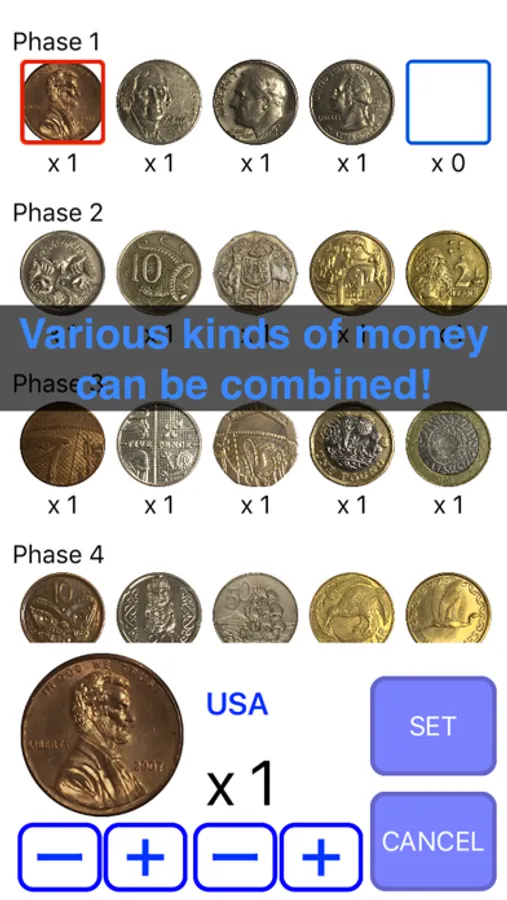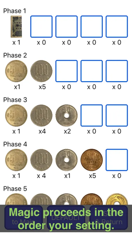 Set the type and number of money in phases of up to 10 stages. You can proceed with the magic that money appears, changes, and disappears in the order that you set. Up to 5 types of coins can be included in each phase, and up to 25 coins can be displayed in the screen throughout all phases.