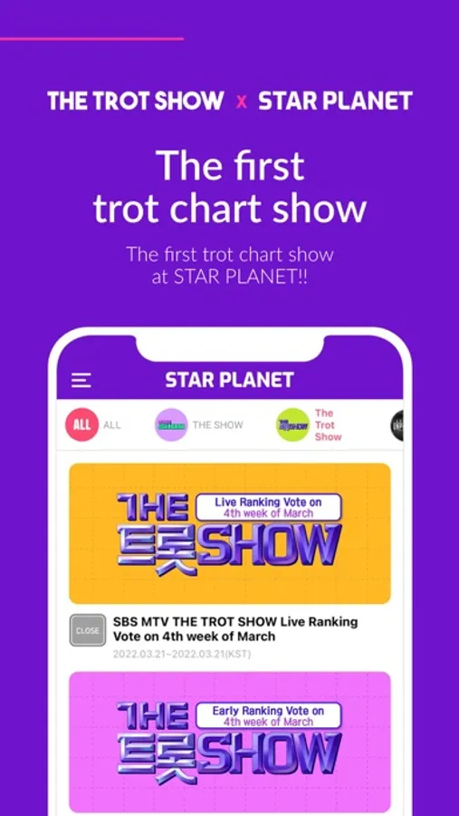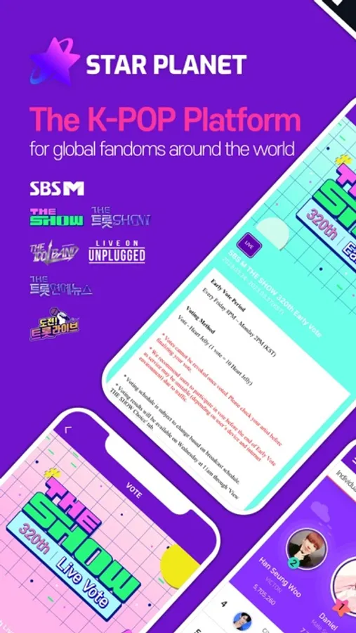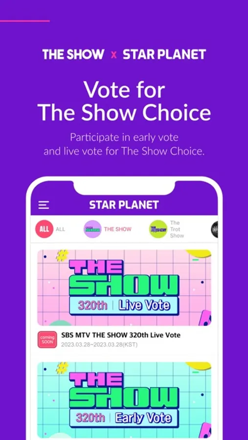 Participate in vote for ‘SBS M THE SHOW’, ‘SBS M THE TROT SHOW’, ‘SBS M LIVE UNPLUGGED’, ‘SBS INKIGAYO’. Vote and make my artist shine like a star!
