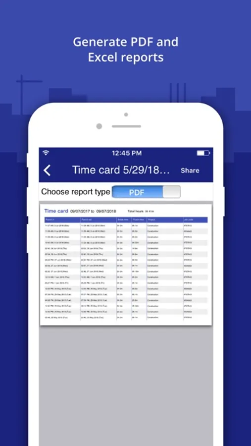 Punch In / Out Timesheet App is the easiest way to track working hours on multiple projects. Create projects, job codes and track daily shifts. Users punch in and out on their mobile devices, optionally add breaks and details, generate professional looking PDF and Excel time cards and send them to the management or accounting. Analyze time spent on projects with the Dashboard. PDF and Excel time card reports are stored on the device, can be shared via cloud drives, emailed or printed. Find your time cards quickly and easily anytime anywhere.
