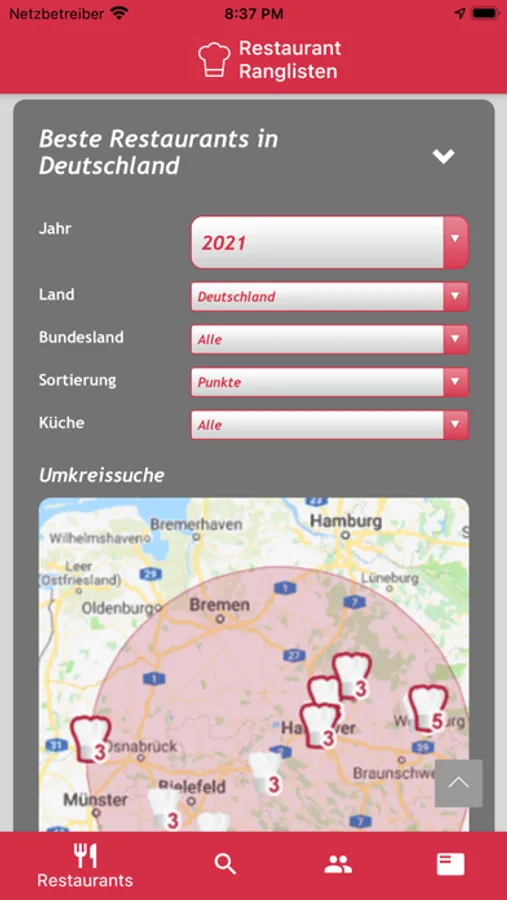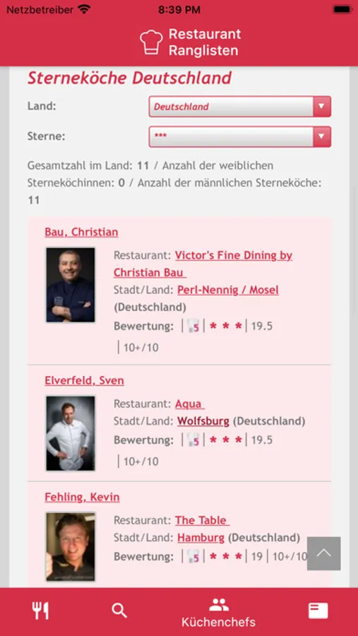 Das Restaurant-Ranglisten App findet die besten Restaurants in Deutschland, Europa, USA und Asien. Sie bekommen für alle Länder, Regionen, Städte und Orte, in denen es gute Restaurants gibt, Restaurants zur Auswahl. Mit der Umkreissuche können Sie die besten Restaurants in Ihrer Nähe finden. In unserem "Who is Who" der besten Köche und Gastgeber bekommen Sie umfassenden Informationen z.B. über Paul Bocuse, Eckart Witzigmann, Joachim Wissler oder Harald Wohlfahrt.