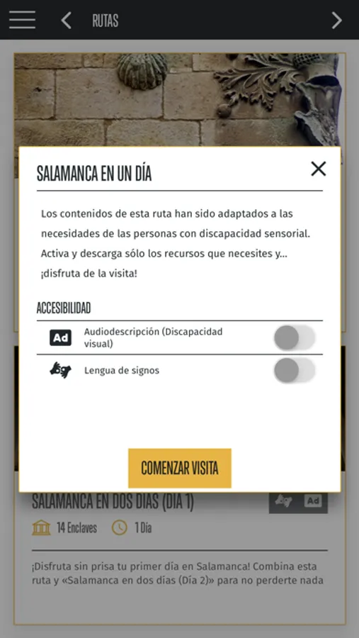Gracias al impulso de Turismo de Salamanca, la Fundación Orange y de GVAM en el marco del proyecto Áppside, esta aplicación incluye contenidos accesibles para personas con discapacidad visual y auditiva.