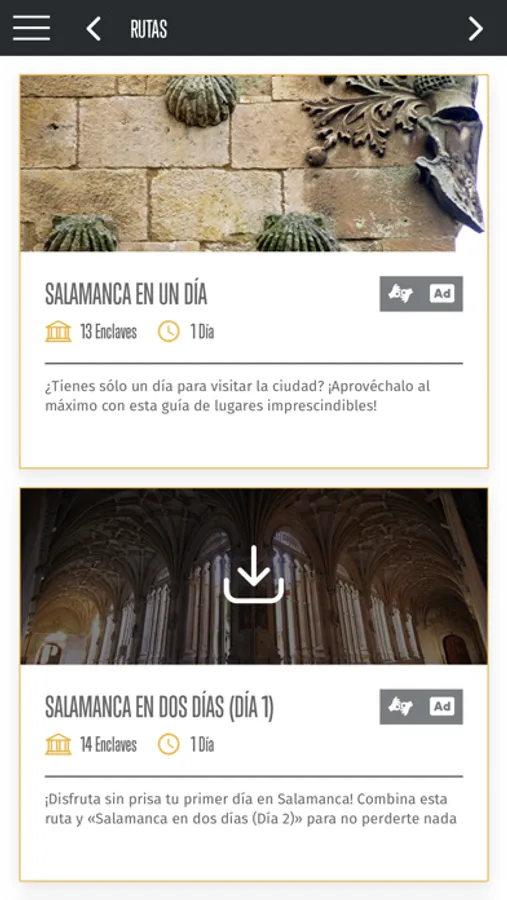 ¿Quieres visitar Salamanca a tu ritmo y sin perderte nada de lo que te gusta? ¿Necesitas ayuda para organizar tu visita? ¿Buscas una audioguía completa, versátil y entretenida? ¿Quieres estar al día de los eventos de la ciudad? Descarga esta app, elige tu ruta… ¡y empieza a explorar Salamanca de la forma que más se adapte a ti! Hay recorridos para la primera visita a la ciudad, propuestas para niños… y novedosos itinerarios temáticas por los rincones menos típicos, ¡para todos los gustos! Si lo prefieres, puedes utilizar el Buscador principal para ir directo a aquello que te interesa.