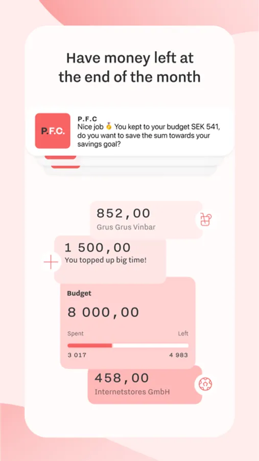 P.F.C. is a service for anyone who wants to understand their finances. Get to know your habits, start a savings goal and spend your money on the things that matter to you.