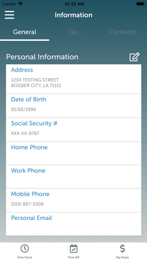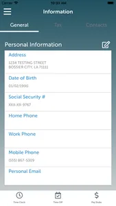 Employees can easily view their personal information, pay stubs, tax forms, and work schedule. In addition, employees can quickly clock in and out, and request time off.