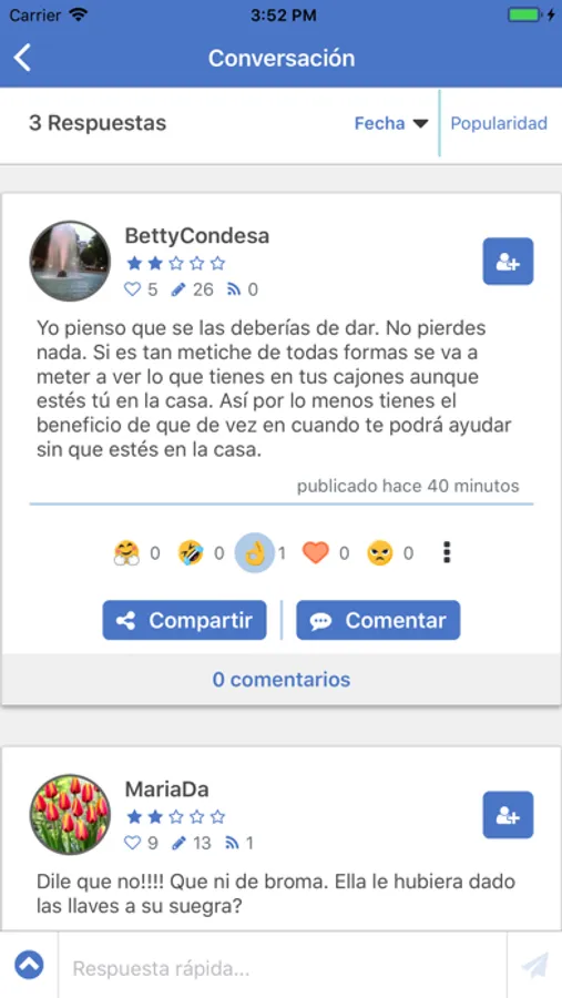 La app de Corazón de Mamás te proporciona un espacio para que tengas conversaciones con otras mamás donde te puedas sentir relajada y seas honesta. En las otras redes puedes poner la foto de lo bonito que salió el concierto de tu hija, pero es en Corazón de Mamás donde obtienes el consejo de cómo hacer ese disfraz perfecto y compartes todas las lágrimas que involucró el esfuerzo para que fuera un éxito. Esta es tu comunidad y depende de ti para que hagas preguntas, compartas soluciones, y si lo que escribió alguien más te causo alguna emoción entonces le digas usando emojis (a todas nos gusta saber si lo que escribimos le gusto a alguien más). También, si crees que una publicación no debería de estar en Corazón de Mamás entonces puedes darle clic a los tres puntos, y después al botón: “Reportar Troll”.