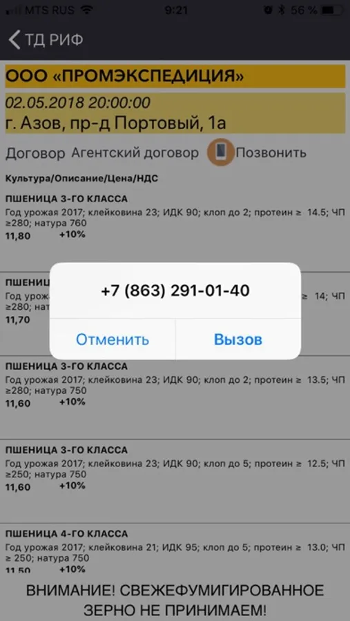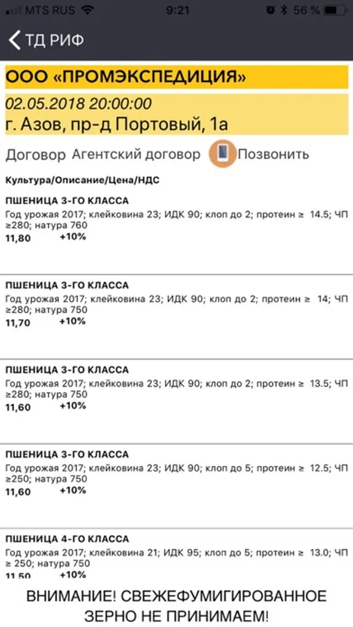 Торговый Дом «РИФ» осуществляет закупку и продажу сельскохозяйственной продукции на внутреннем рынке России и экспорта в страны ближнего и дальнего зарубежья. В этом приложении актуальные закупочные цены на пшеницу, ячмень, кукурузу, горох. Вы сможете увидеть всю необходимую информацию по элеваторам и получать изменения цен. Прием товара на элеваторе, обработка документов, отправка груза за рубеж происходит быстро, что давно уже оценили многие фермерские и крестьянские хозяйства - поставщики зерна и сельхозпродукции.