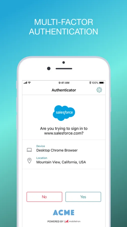 MobileIron Authenticator is a modern multi-factor authentication solution that reduces the risk of data breaches resulting from stolen corporate credentials. As a user, you can now confirm or deny login attempts to your business apps using your mobile phone. This prevents hackers from using your identity to steal business information.