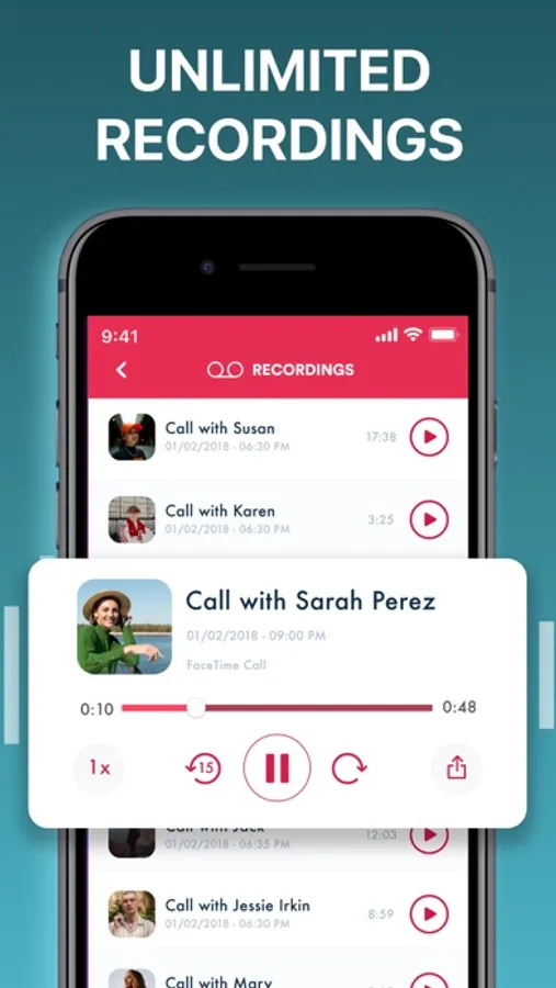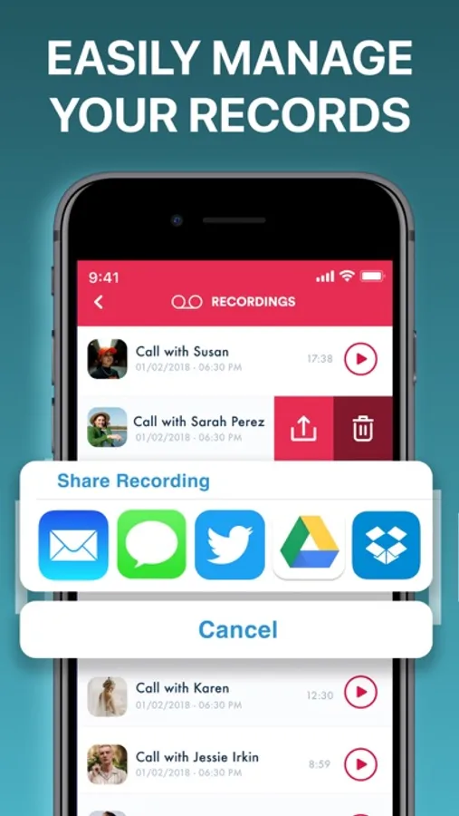 Once you complete your call, your recording will be immediately available under the recordings tab. From there, you can re-play, delete, save to Dropbox, iCloud and Google Drive or share via email, iMessage, Facebook and Twitter.
