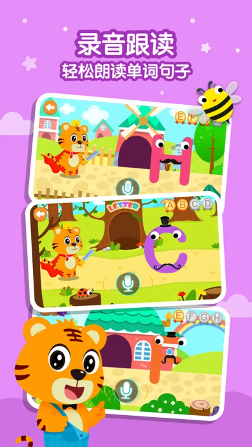 26个字母单元、16+高频词组、200+英文单词、44首英文儿歌、16+互动游戏,分阶段对字母和单词进行专项学习。以认、说、写、练的方式学习字母,更有儿歌和闪卡的结合,轻松学习常用高频词汇。