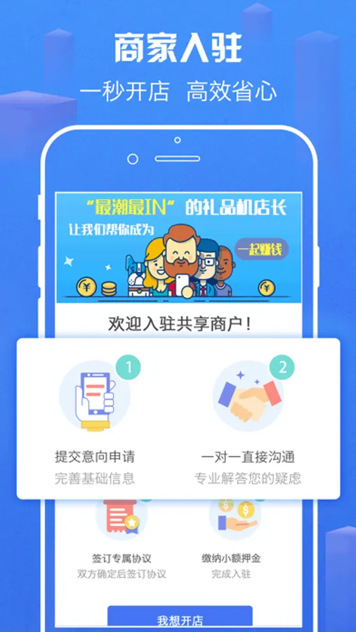 提交意向申请;一对一电话沟通;在线签订协议;缴纳小额押金;让商家一秒开店。