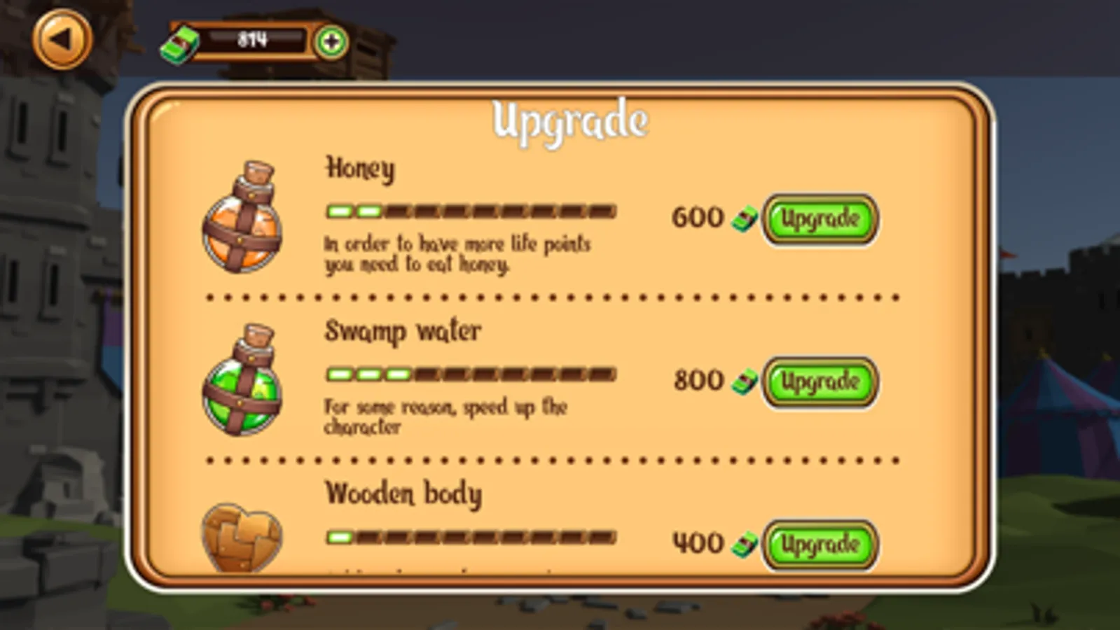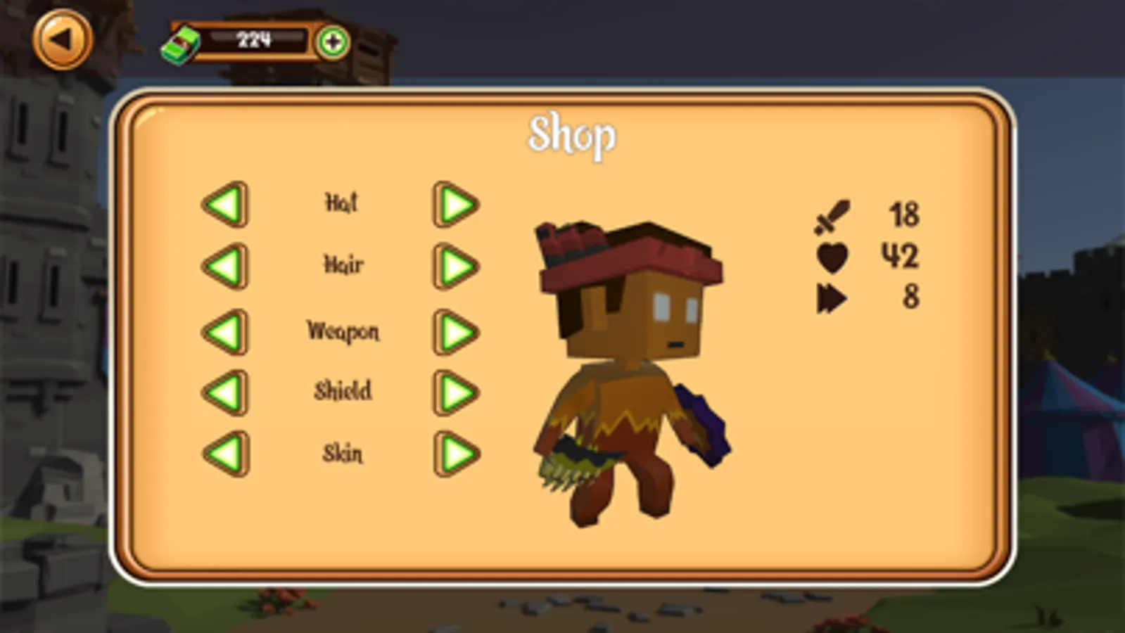 - Buy new armor, skins, weapons, shields and hats for the character.
