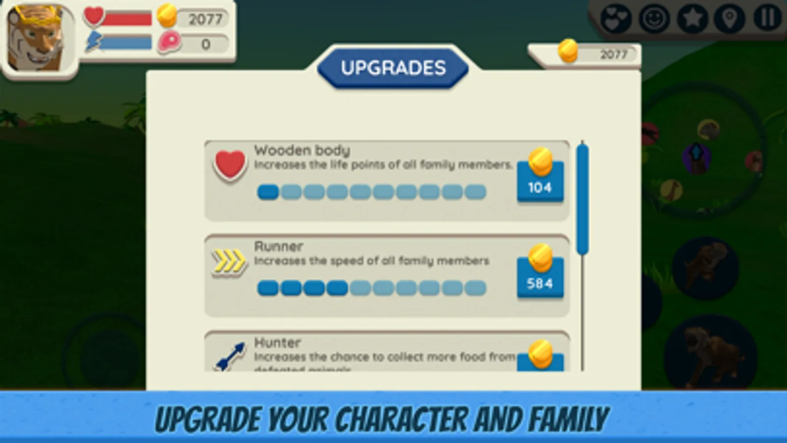 There is an opportunity to improve the individual characteristics of family members and characteristics that affect all tigers in the family at once. Do not forget to improve the characters! Get experience doing tasks and hunting. After receiving a level, the character can spend it on points of attack, energy or life. There are also special skills that allow you to increase speed, collect more food, get more resources for actions in the game, etc.