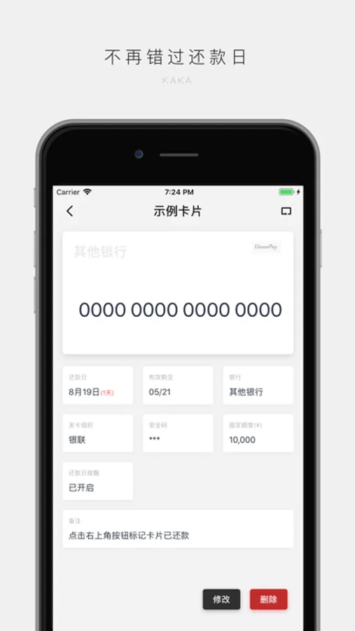 KAKA是一款干净、简洁、安静的信用卡管理应用。