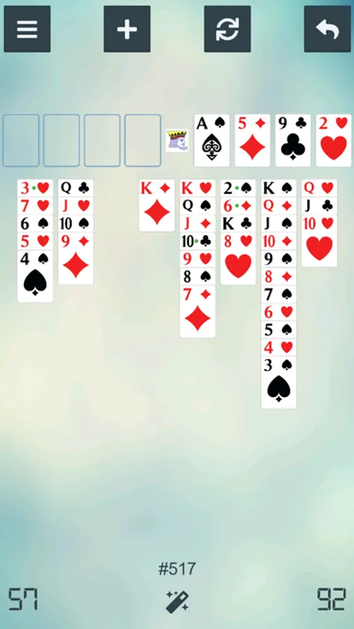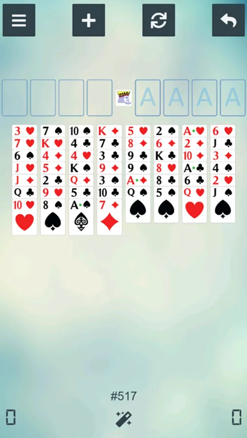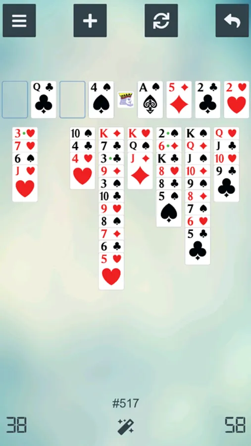 Cards are dealt face-up into eight cascades, four of which comprise seven cards and four of which comprise six.