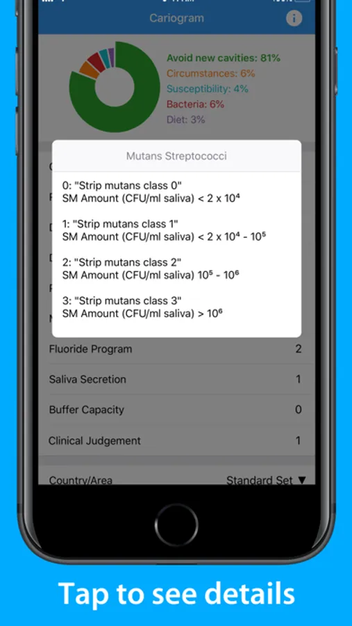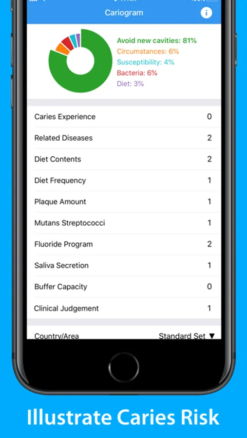 Cariogram is an educational program developed for better understanding of the multifactorial disease dental caries. It illustrates the "caries risk" and possible interactions between caries related factors. A purpose is to encourage preventive measures before new cavities will occur. The program can not replace the personal professional judgment of the caries risk.