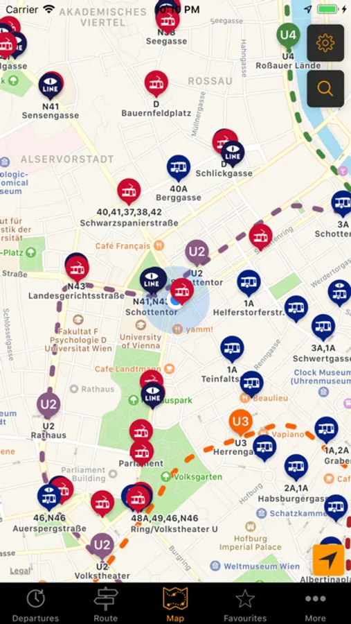 - Interactive map with stops, search and route