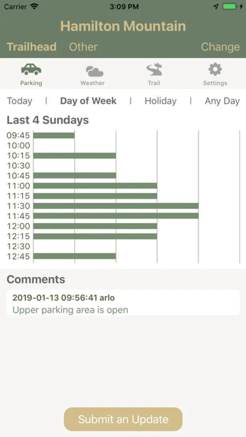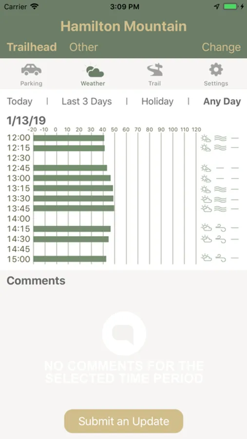 TrailCheck lets you select a trailhead, or a specific location on a trail, to view current conditions. Or use the time filters to show averages for recent days or similar days to help predict what you'll run into.