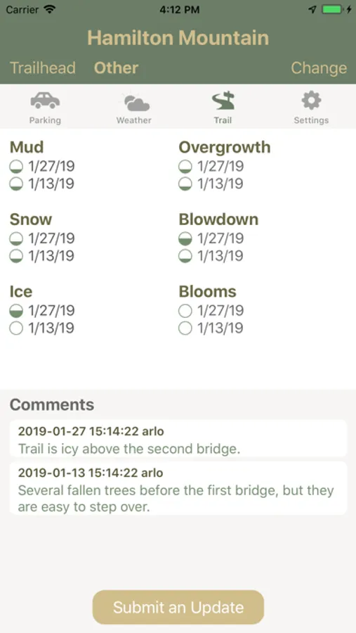 Contributing to TrailCheck's database is easy. Click to submit a parking, weather or trail update and optionally select a location on the trail. Move a few sliders to show the conditions, and add comments if you want to share more details. You can enter updates from the trail, back at the trailhead or from home later. Every submission makes the app work better!