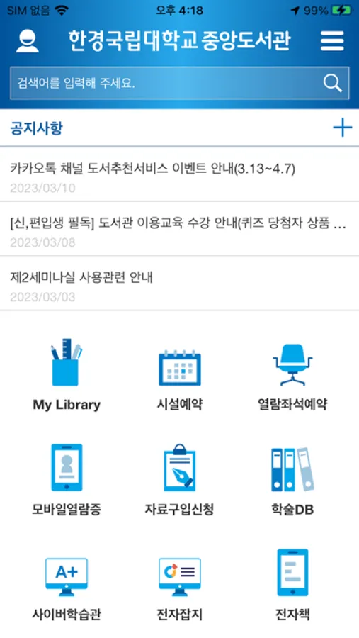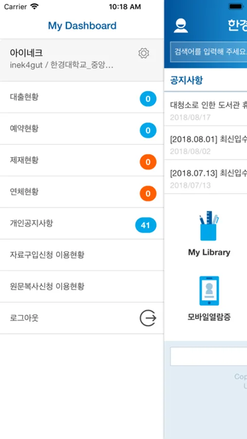 대출사항 조회 및 개인공지사항 서비스를 제공합니다.