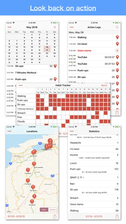 Count the actions. When you record the action with number, shows the sum, average, min, max for the specified period. You can see: How much did you spend the money? How far did I swim?