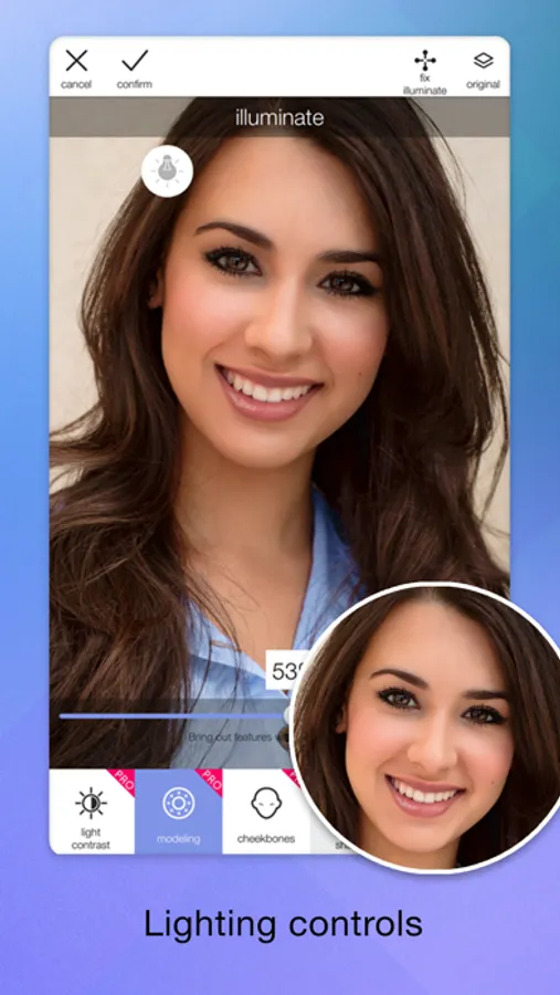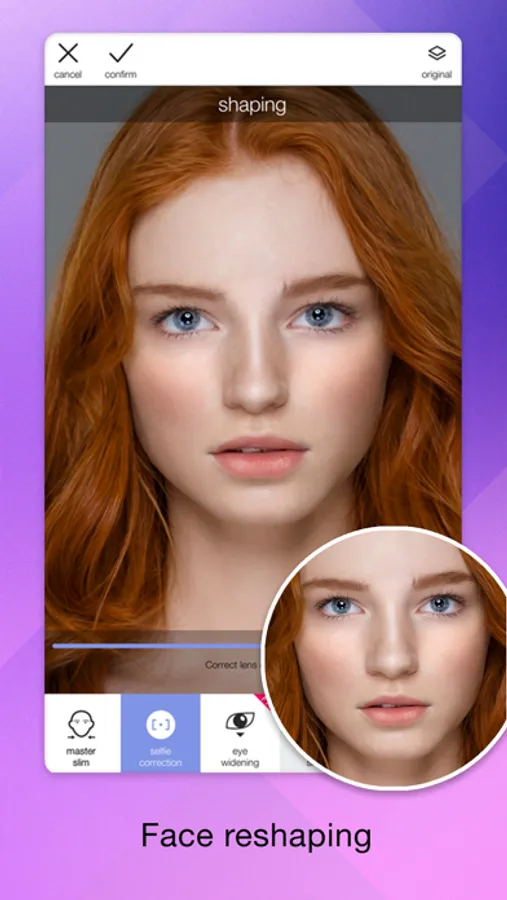 Phone cameras distort your image, making faces look wider and and noses bigger. Our unique shape sliders make it easy to fix!. Sharpen your jawline and draw attention to your eyes.