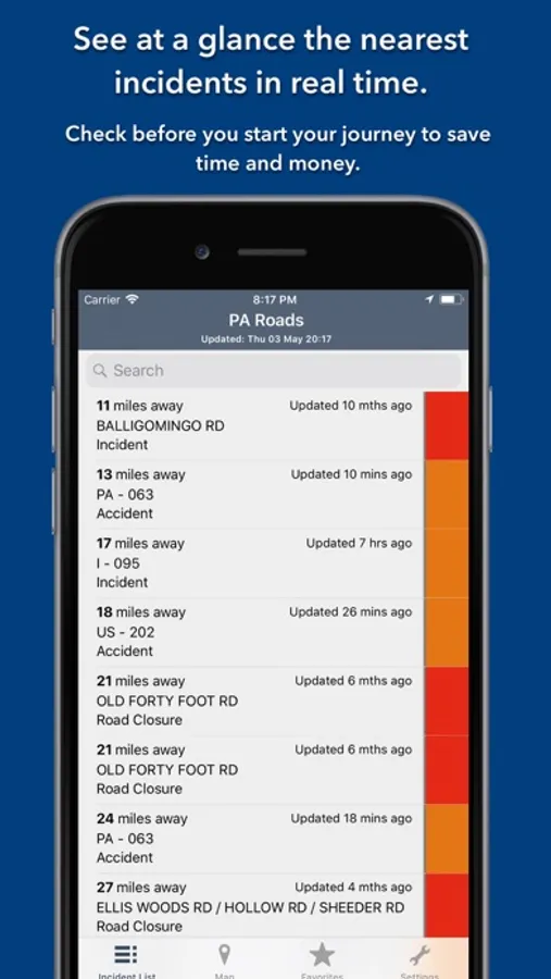 - You can quickly see the distance the incident is from you, the road name and the type of incident.