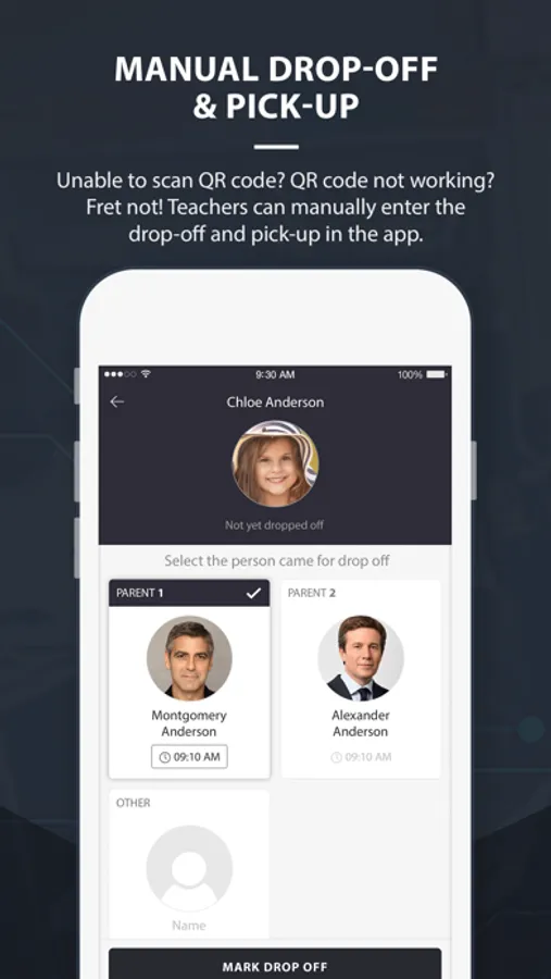 Manual Drop-off & Pick-up: Unable to scan QR code? QR code not working? Fret not! Teachers can manually enter the drop-off and pick-up in the app.
