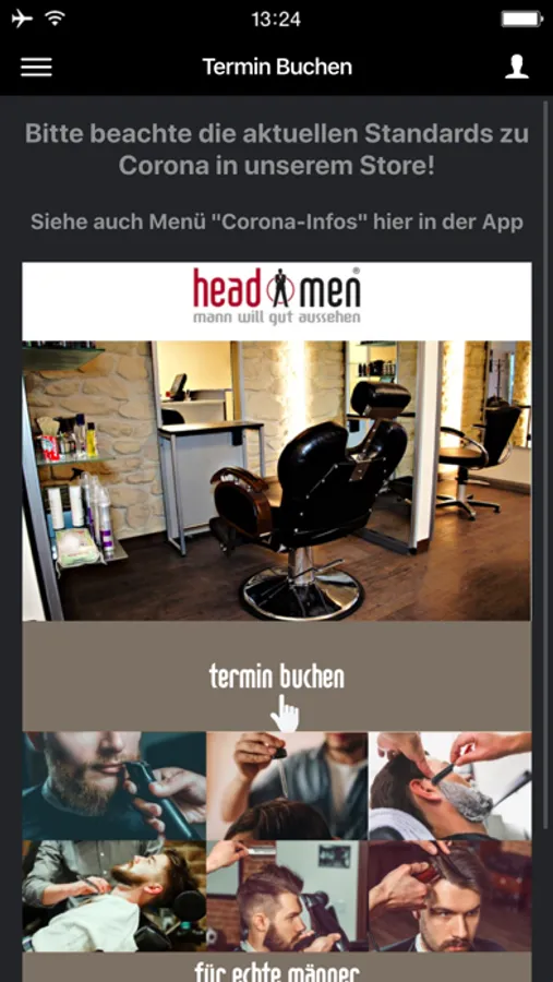Ein Klick zu deinem Date mit uns. Genieße die Vorteile unserer App wie z.B. unsere digitale BonusCard für Herren. Buche deinen Termin direkt online und lass dich über Angebote und Trends informieren. head men - der BarberShop jetzt auf deinem Smartphone - Digitale BonusCard Herren - News - Chat - Termin Buchen - Galerie