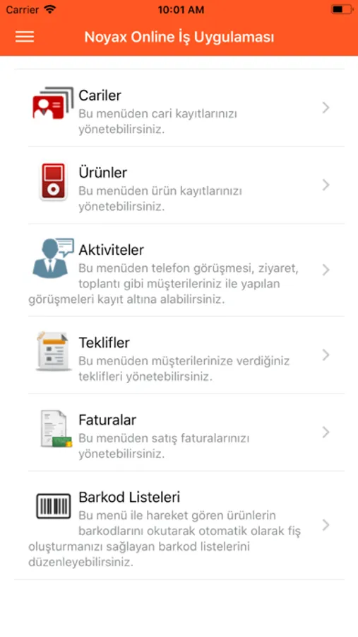 Noyax Mobile ile carilerinizi listeleyip tüm bilgilerine ulaşabilirsiniz. Cari ekstresini görüntüleyip müşterinize eposta ile gönderebilirsiniz. Müşterinizin yanında teklif oluşturup, fatura düzeneleyebilirsiniz. Ayrıca müşterileriniz ile ziyaret, toplantı gibi aktiviteleri kayıt altına alıp yaptığınız tahsilatları işleyebilirsiniz.