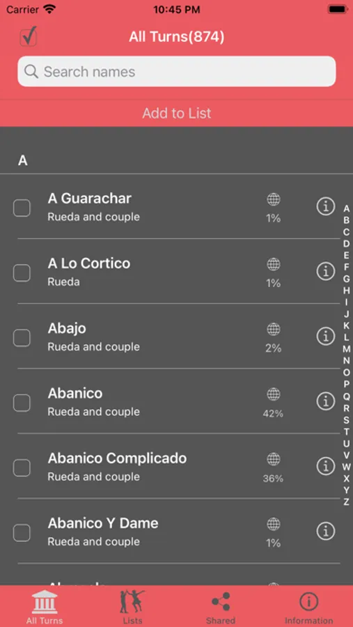 The purpose of the app is to list all available turn names for salsa dancing, the turn name list is fetched from a continuously updating source, so that new turn names will become available over time, at this time there are 900+ moves/figures names available.