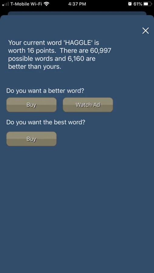 Having trouble finding words that are worth a lot of points? Use help to know how good your word is based on all possible words from the given letters and get a better word or the best possible word for your letters.
