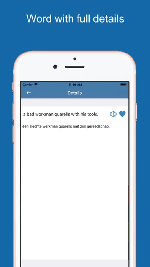 - Want to save a word meaning in the favourites? Tap the heart button and we will add this word automatically in your favourites. You can easily access to it anytime within the favourites choice in the options menu.
