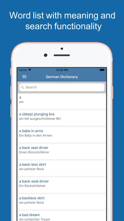 Our new English to German Dictionary and Translator app is a light weight and elegant tool. You can find over 1,05,000+ english words with their German meanings for Free on your smartphone! You can easily search for any word you want and we will take care of giving the meaning of it and the best thing is that you can take quiz to test your knowledge in this Indo-Aryan language.