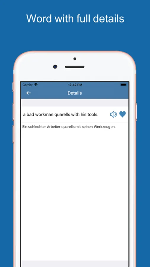 - Want to save a word meaning in the favourites? Tap the heart button and we will add this word automatically in your favourites. You can easily access to it anytime within the favourites choice in the options menu.