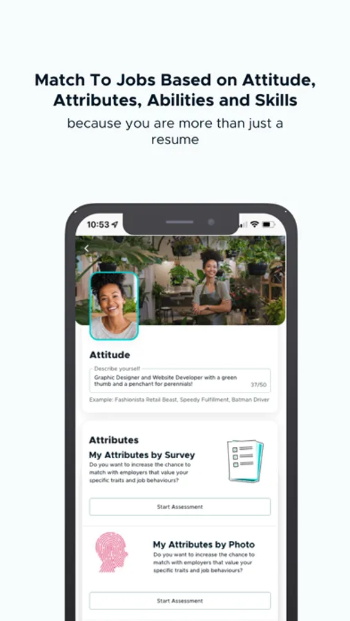 No resumes needed. Because a resume doesn't capture all that you have to offer. The best way to keep you doing work is by helping you get recognized by companies hiring for your natural attitude and attributes and abilities. We are all about helping you identify what makes you ready and capable to get the job that best fits you. Opt in to different tools to help build a talent profile that shows off who you are and your work brand.