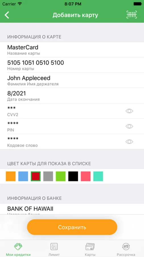 Храните все свои банковские карты в одном месте с приложением Кредитница. Вы можете ввести карту вручную или отсканировать ее при добавлении.