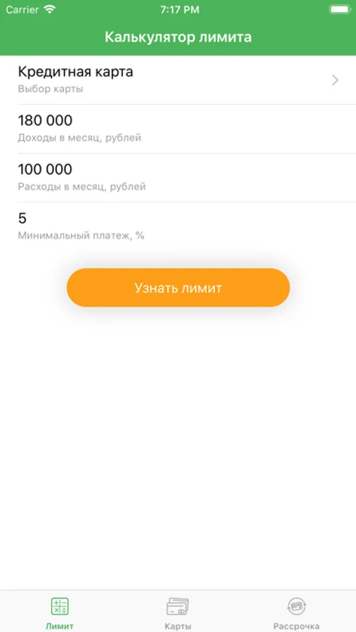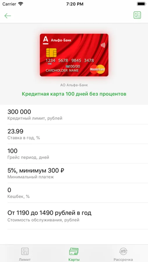 Вы можете ввести параметры расчета вручную или же выбрать кредитную карту для расчета