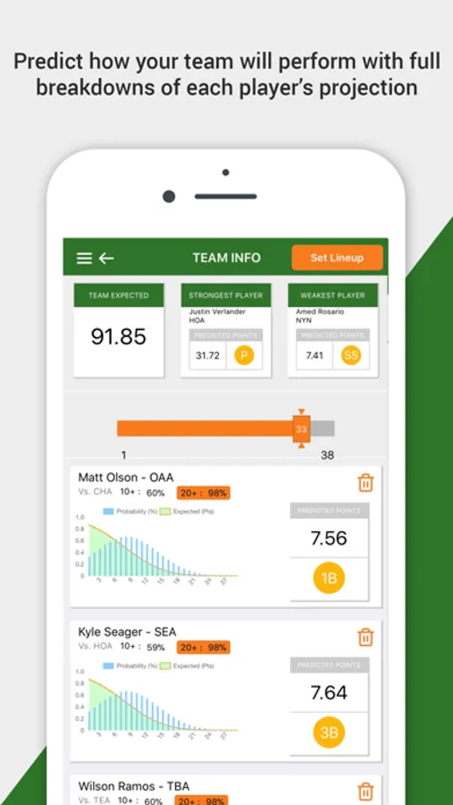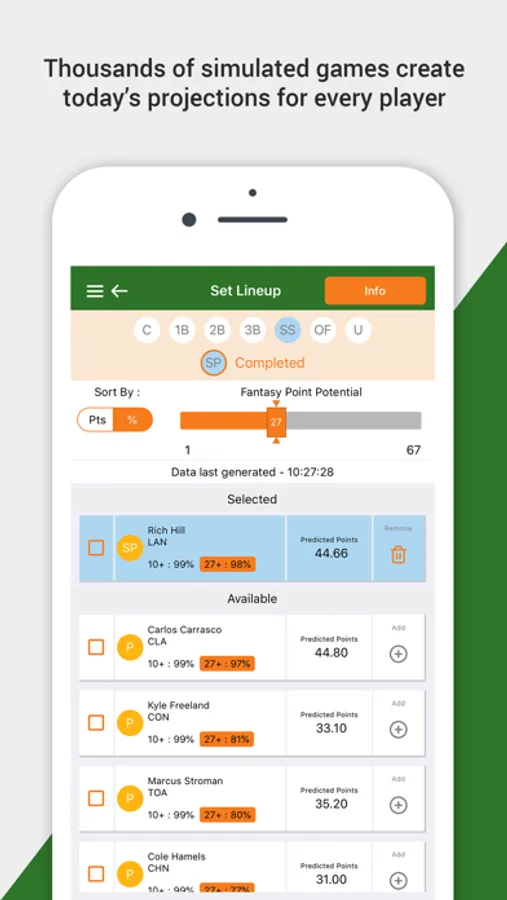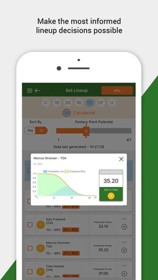 The DFS Predictor app runs thousands of games in the background with the time-honored Strat-O-Matic game engine. Players’ projected stats and fantasy points are displayed. The Predictor app also shows you the percentage chance your player will hit various fantasy-point milestones (or fantasy-point totals).