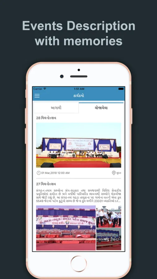 Members of samaj can get information about events that is upcomings or already finished with route of destintiation and also collection of memories in form of images.