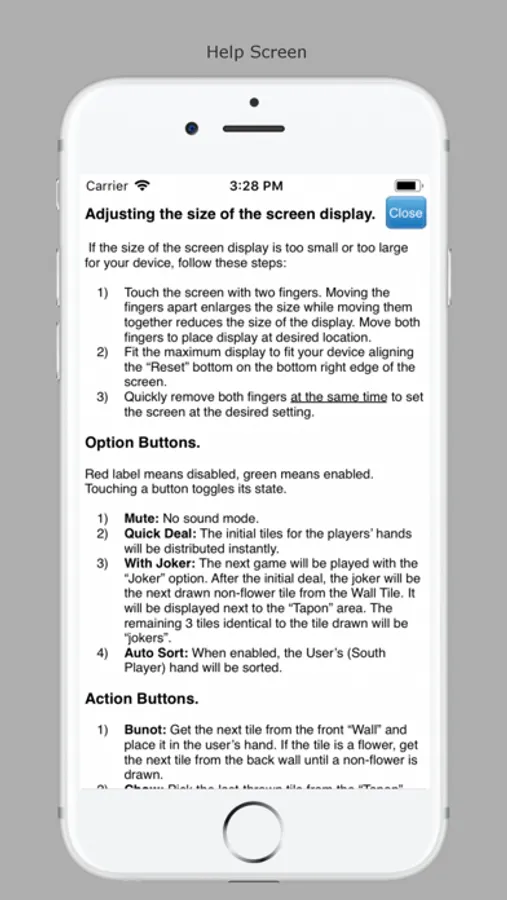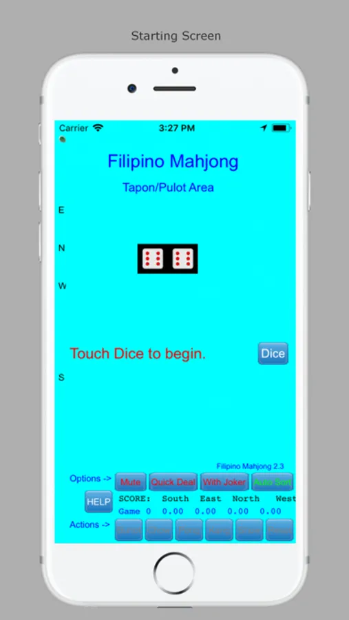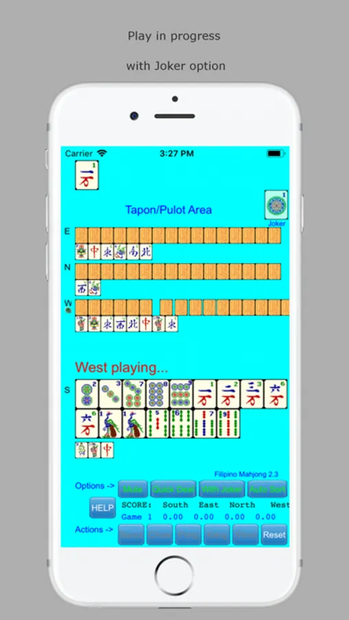 The full description of how to play this game is available on google search under "Filipino Mahjong". Four players are needed to play the actual game: South, East, North and West seated counter-clockwise in that order. The human player is "South", labelled "S", while the other three labelled "E", "N" and "W" are automatically played by the computer.