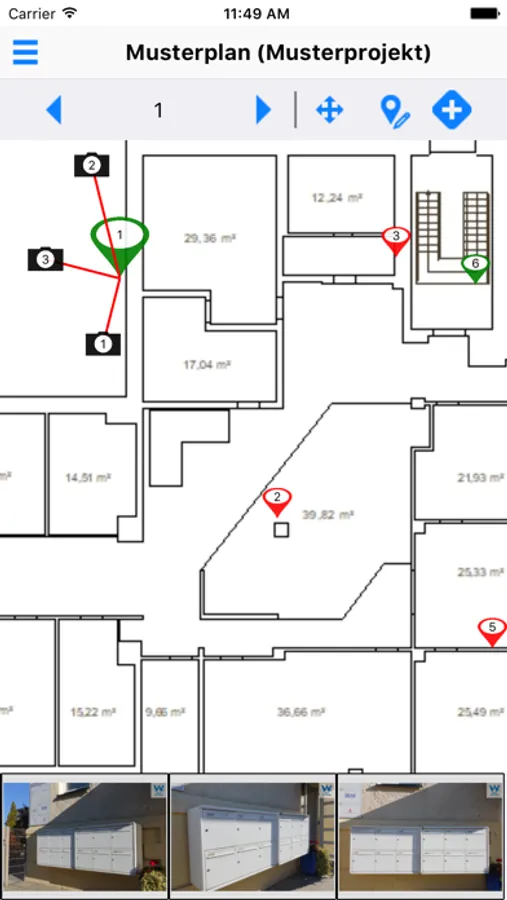 Zu jeder Markierung können beliebig viele Bilder aus Galerien oder über die Kamera-App Ihres Mobilgerätes hinzugefügt werden. Sie können für jedes Bild einen Kamerastandort innerhalb des Plans festlegen, der bei aktivierter Markierung im Plan angezeigt wird.