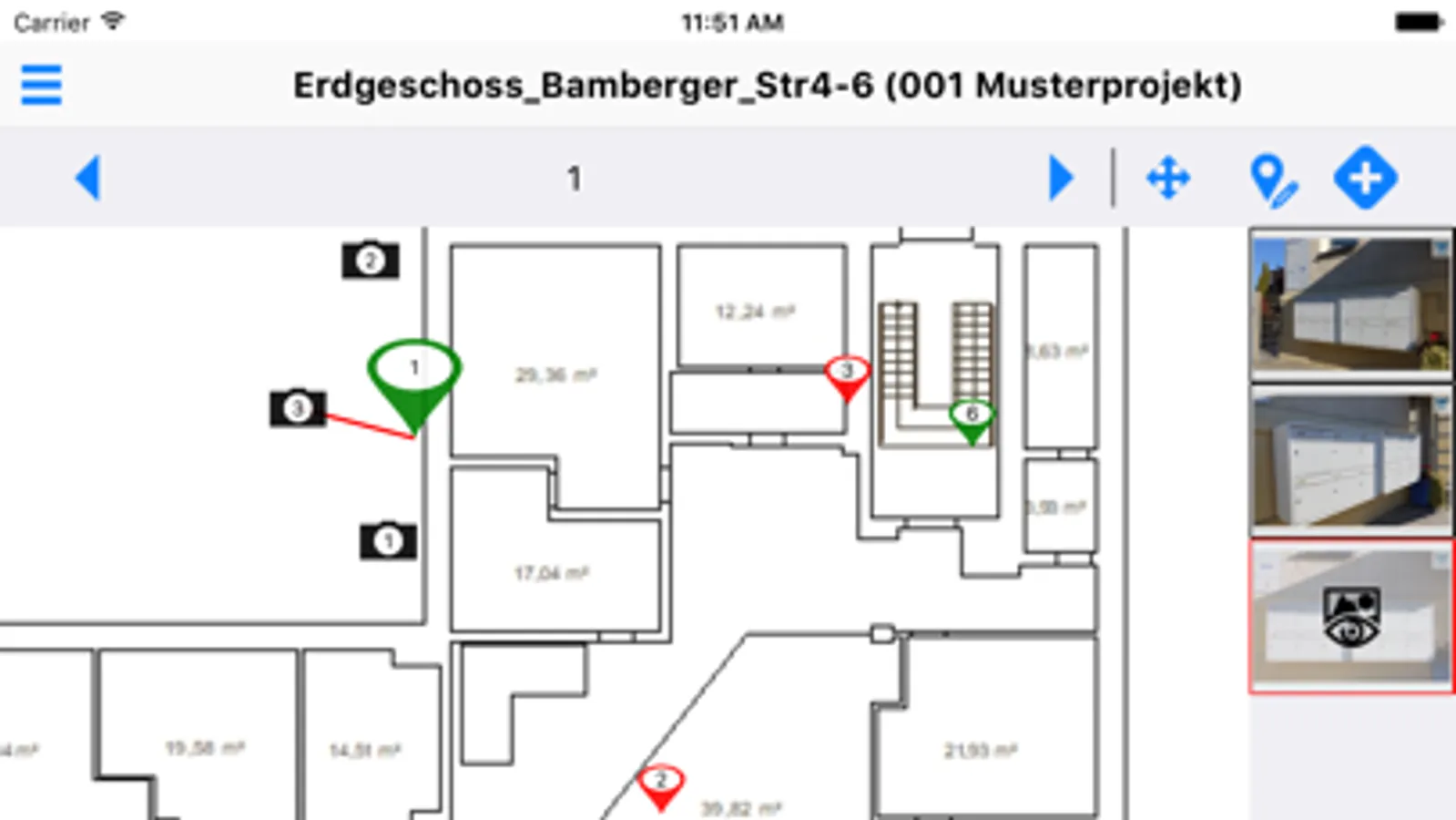 Nach Auswahl eines Projekts und Plans wird dieser angezeigt. Auf dem Plan werden Markierungen dargestellt, neue Markierungen können hinzugefügt werden. Die aktive Markierung wird hervorgehoben. Die Markierung dient der Gruppierung von Bildern zu einem Sachverhalt und zu einem Bauteil.