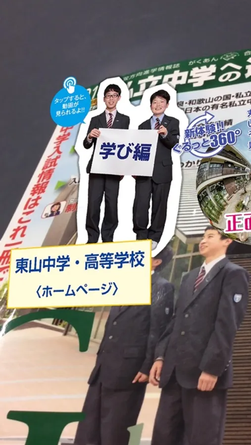 2.がくあん書籍内のマーカーとなる画像にカメラをかざすと、ポップアップが浮かび上がり、タップすると学校の紹介動画やウェブサイトへのリンクなどのARコンテンツが表示されます。