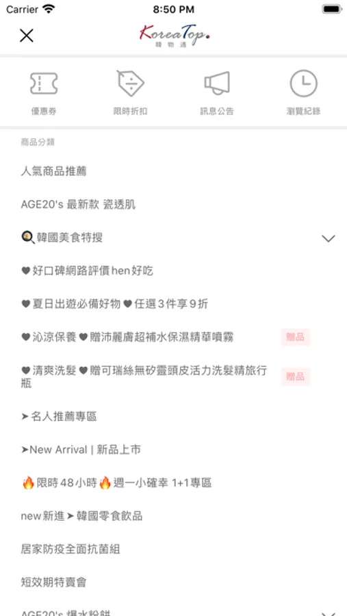 Koreatop韓物通官方APP不定時推出限定優惠!APP會自動推播訊息,讓你不再錯過任何好康活動。Koreatop韓物通集合韓國彩妝/保養品/食品/娛樂/電影/3C資訊,即時享有韓國流行零時差,不用出國也能暢遊韓國!!